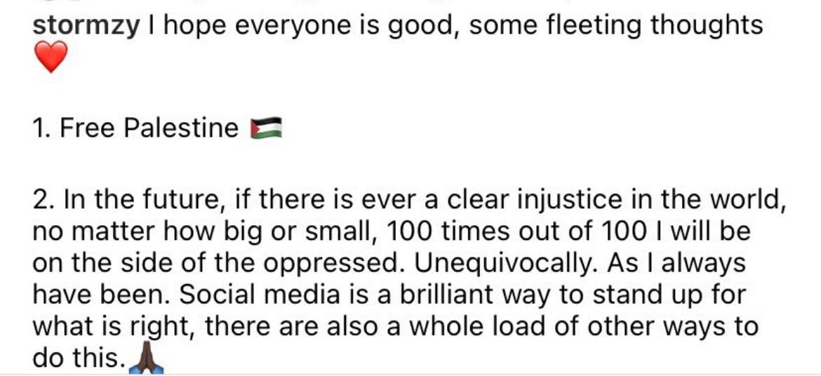 But Stormzy had taken a side. He wrote “Free Palestine” he performed at a Palestine and Sudan benefit concert. He said he would always fight injustice. You can’t then just be neutral.